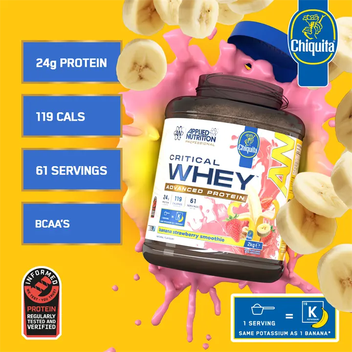 Critical Whey Protein has been developed using a unique blend of Whey Protein Concentrate, Whey Protein Isolate & Hydrolysed Whey Protein. Whey Protein Concentrate is produced by Ultra-Filtration Technology containing high levels of Protein and Branched Chain Amino Acids (BCAAs). Whey Protein Isolate is the highest quality of Protein and is produced using Cross-Flow-Micro-Filtration. Hydrolysed Whey Protein is a pre-digested Protein enzymatically broken down into Peptides. These high biological value and easily digested Proteins support the growth and maintenance of muscle.