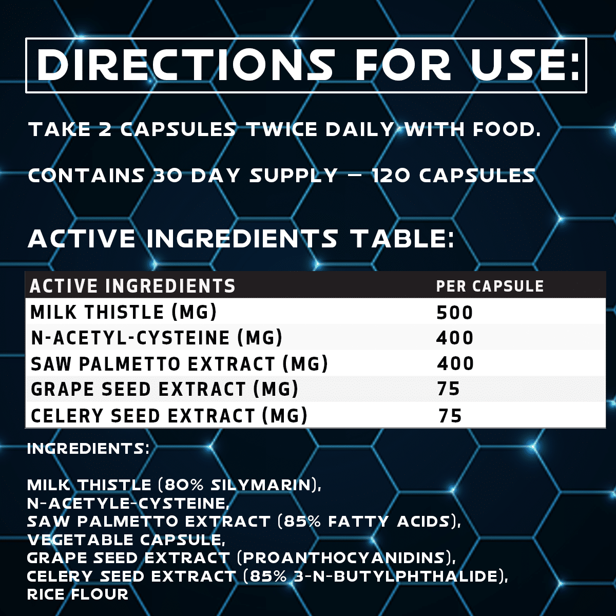 Milk Thistle (80% Silymarin), N-Acetyle-Cysteine, Saw Palmetto Extract (85% Fatty Acids), HPMC Vegetable Capsule, Grape Seed Extract (Proanthocyanidins), Celery Seed Extract (85% 3-N-Butylphthalide), Rice Flour