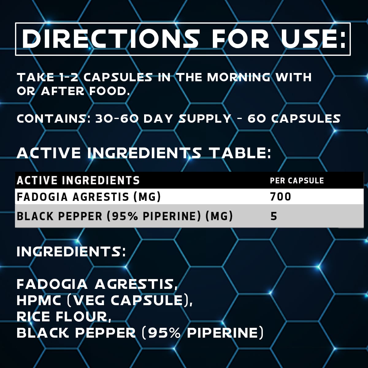Ingredients: Fadogia Agrestis, HPMC (Veg Capsule), Rice Flour, Black Pepper (95% Piperine)